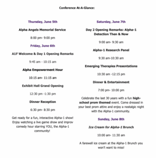 The Alpha-1 Foundation (A1F) is proud to host the 2025 A1f National Conference from June 6th thru June 8th in Miami, Florida. This year A1F commemorates the 30th anniversary, a milestone that commemorates and honors the legacy of those who have impacted the Alpha-1 community, especially Alphas and their families who A1F serves. A1F is excited to kick off the largest annual gathering of the Alpha-1 community, both in-person and on the virtual platform. Over the 3 conference days, attendees will learn from leading Alpha-1 experts, meet with fellow Alphas, learn all about A1F programs and resources that can inspire you each day, and hopefully, you will be motivated to get involved!