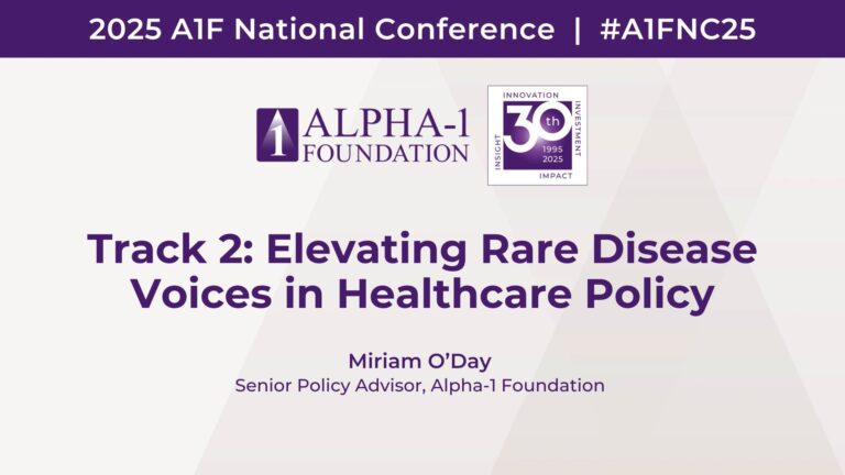 Miriam O’Day, Senior Policy Advisor at the Alpha-1 Foundation, presented “Elevating Rare Disease Voices in Healthcare Policy” at the 2025 Alpha-1 Foundation National Conference.